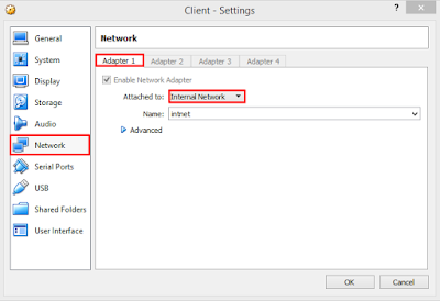 - Kemudian di client kita ubah adapternya menjadi Internal Network.
