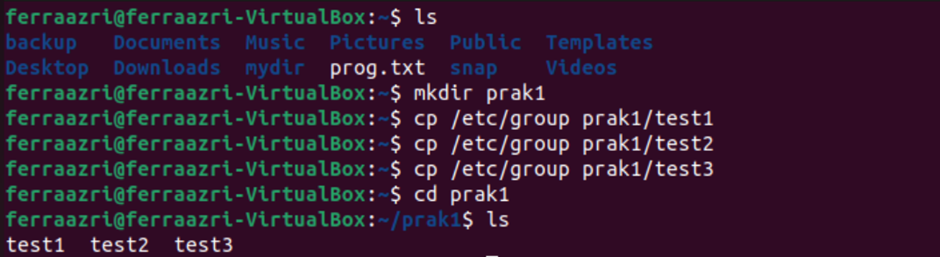 9. Buatlah direktori prak1 pada direktori aktif, kemudian copy-kan file /etc/group ke file tes1 , tes2 dan tes3 pada direktori ini.