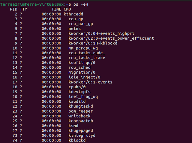 2. Ketik "ps -eH" dan tekan enter. Opsi e memilih semua proses dan opsi H menghasilkan tampilan proses secara hierarki. Proses child muncul dibawah prosesparent. Proses child ditandai dengan awalan beberapa spasi.